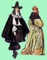 На даме шелковое (или атласное) одеяние, облегающий корсаж которого сходится спереди в длинный зубец. Глубокое декольте окружал большой бархатный воротник. Широкие свободные рукава доходили до локтя, и из-под них выступали широкие, украшенные оборками рукава рубашки. Пышная юбка, собранная в мелкую сборку у талии, опускалась многочисленными складками.